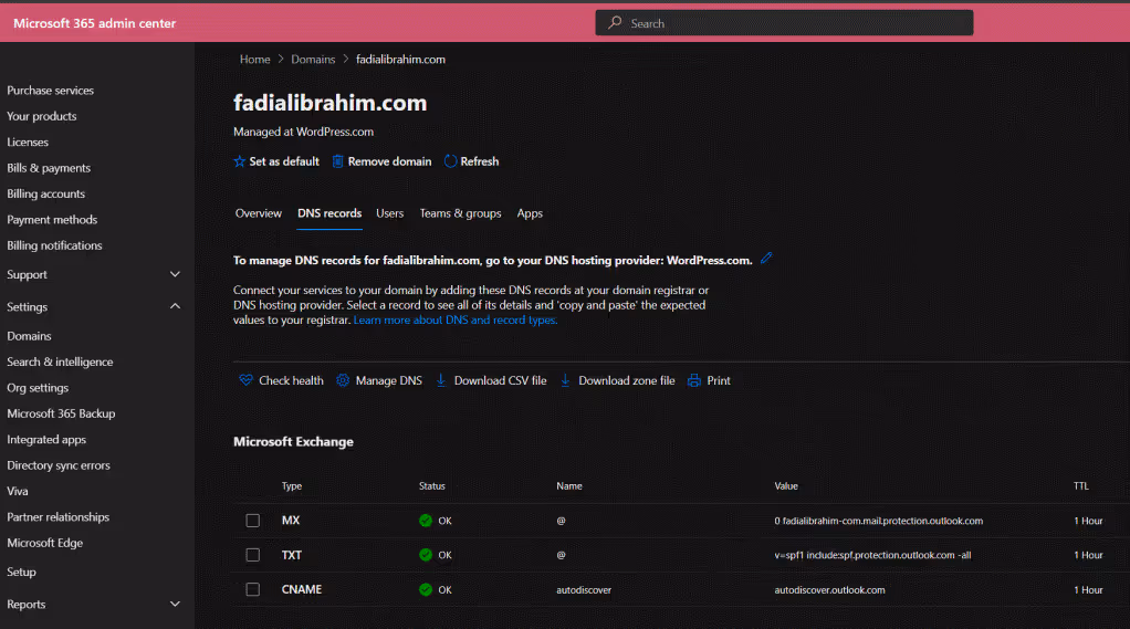 Also, you can check out the health status of your domain andthe DNS records that have been added by Microsoft. This is super useful forAutoDiscovery and securing your Exchange Online emails.