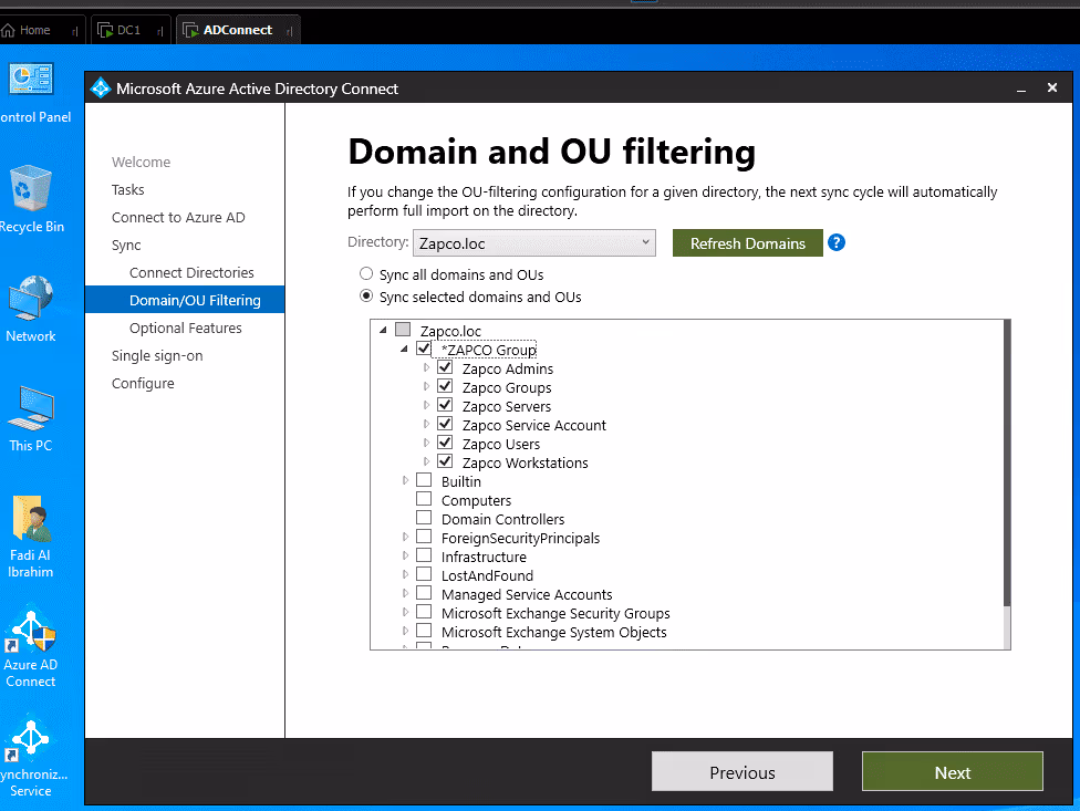 I’ve got a dedicated server set up in my VMware lab forsyncing Active Directory. Once I installed the Azure AD Sync app and assignedthe right admin roles, I could pick the Organizational Unit (OU) to sync withAzure AD.